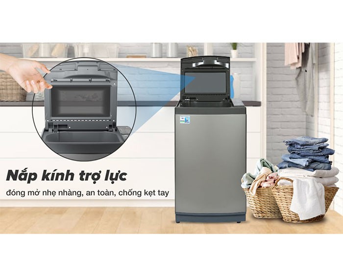 Máy giặt được trang bị nắp kính cường lực có thể chịu được những tác động mạnh bên ngoài, hạn chế trầy xước để máy giặt luôn như mới, an toàn khi đóng, mở nắp máy.