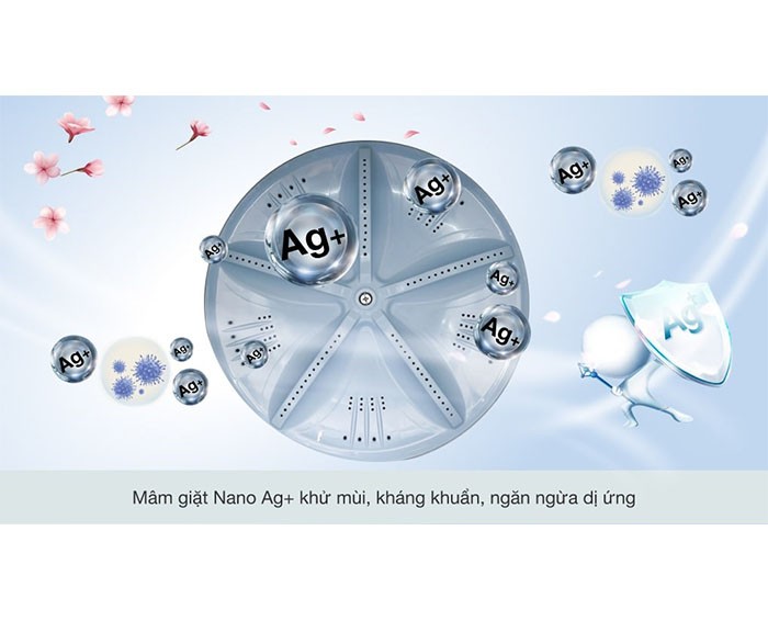 Nhờ việc sản sinh ra các Nano bạc Ag+, công nghệ diệt khuẩn khử mùi Nano Ag+ ở mâm giặt của máy giặt Aqua Sanyo sẽ góp phần khử trùng nước giặt, loại bỏ vi khuẩn và mùi hôi mốc, cho quần áo luôn sạch sẽ, thơm tho.
