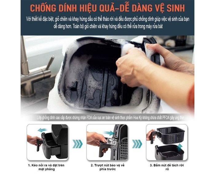 Với thiết kế đặc biệt, giỏ chiên và khay hứng dầu có thể tháo rời và đều được phủ chống dính giúp việc vệ sinh của bạn dễ dàng hơn. Lớp chống dính cao cấp được chứng nhận FDA của cục an toàn vệ sinh thực phẩm Hoa Kỳ không chứa chất PFOA gây ung thư. Toàn bộ giỏ chiên và khay hứng đều có thể rửa trong máy rửa bát. Tay cầm nồi chiên chống nóng kèm nút an toàn để tránh rơi giỏ chiên khi nhấc ra.