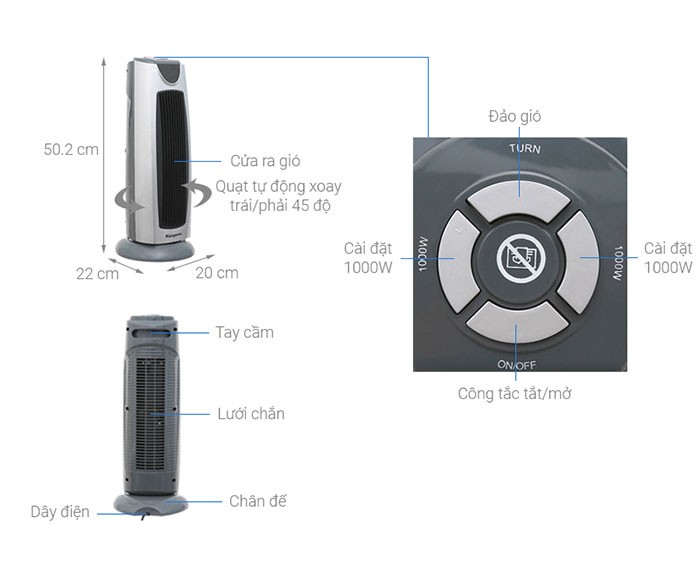 Quạt sưởi có 2 chế độ điều chỉnh công suất là 1000 W và 2000 W, 1 chế độ đảo gió tùy theo nhu cầu mà người dùng chọn chế độ phù hợp