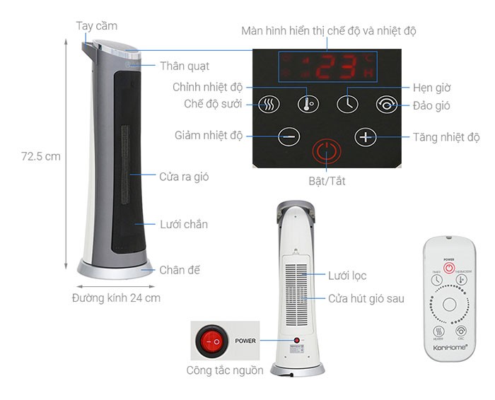 Tiện ích:Quạt xoay trái phải, Điều khiển từ xa, Màn hình LED hiển thị thời gian và nhiệt độ