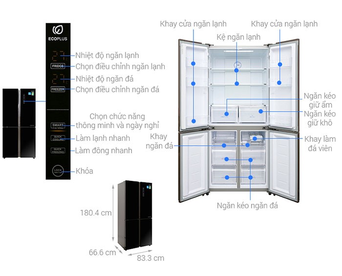 Kích thước tủ lạnh:Cao 180.4 cm - Rộng 83.3 cm - Sâu 66.6 cm - Nặng 105 kg