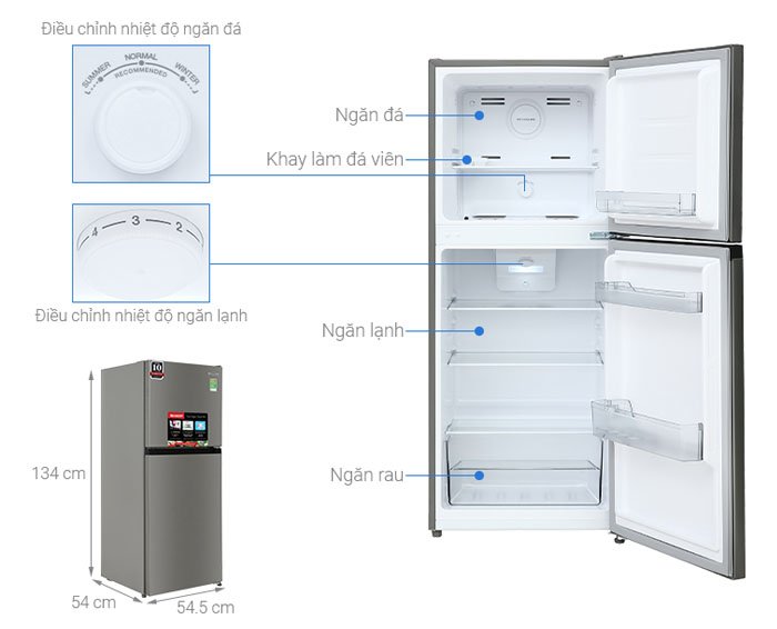 - Dung tích ngăn lạnh 132 lít cùng các khay chia tủ thành nhiều ngăn và 1 hộc rau củ quả, giúp bạn dễ dàng phân bố và bảo quản các loại thực phẩm gọn gàng.